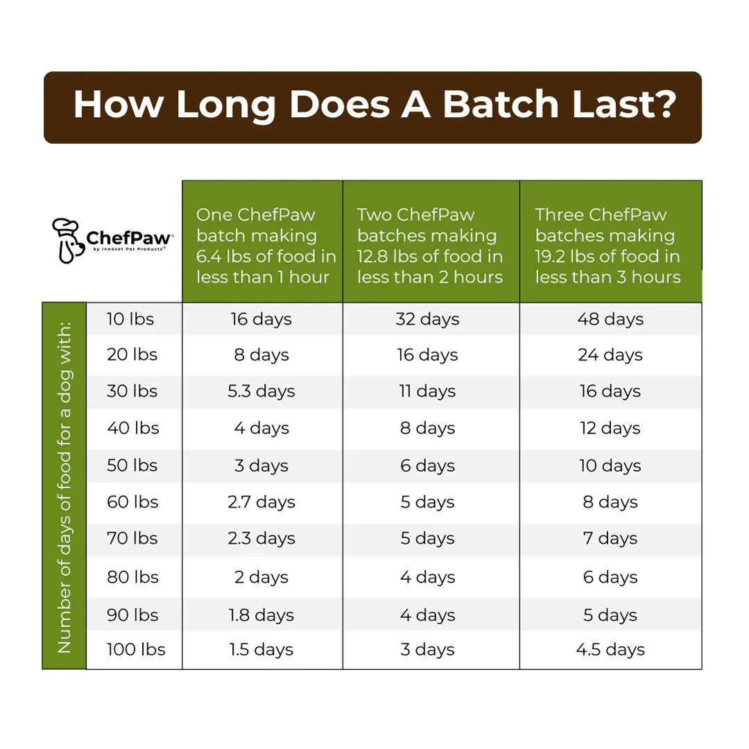 With ChefPaw, you can make a batch or more in 3 hours or less, and it will last you quite a long time, especially depending on the size of your dog. This process not only saves you from the day-long activity of cooking your dog’s food the traditional way, but also saves you money per pound compared to buying kibble.